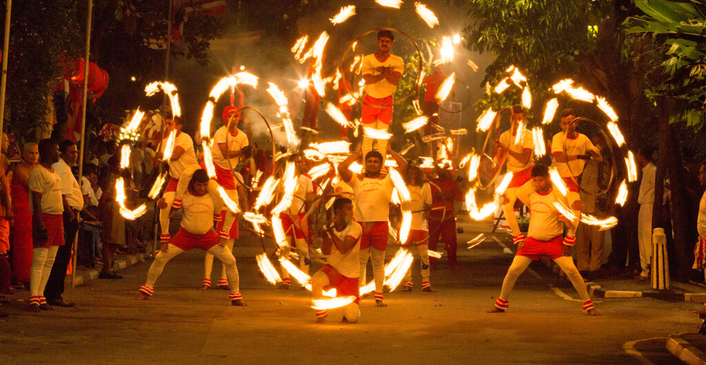 - Kandyan, low-country, and Sabaragamuwa dancers performing under city lights
